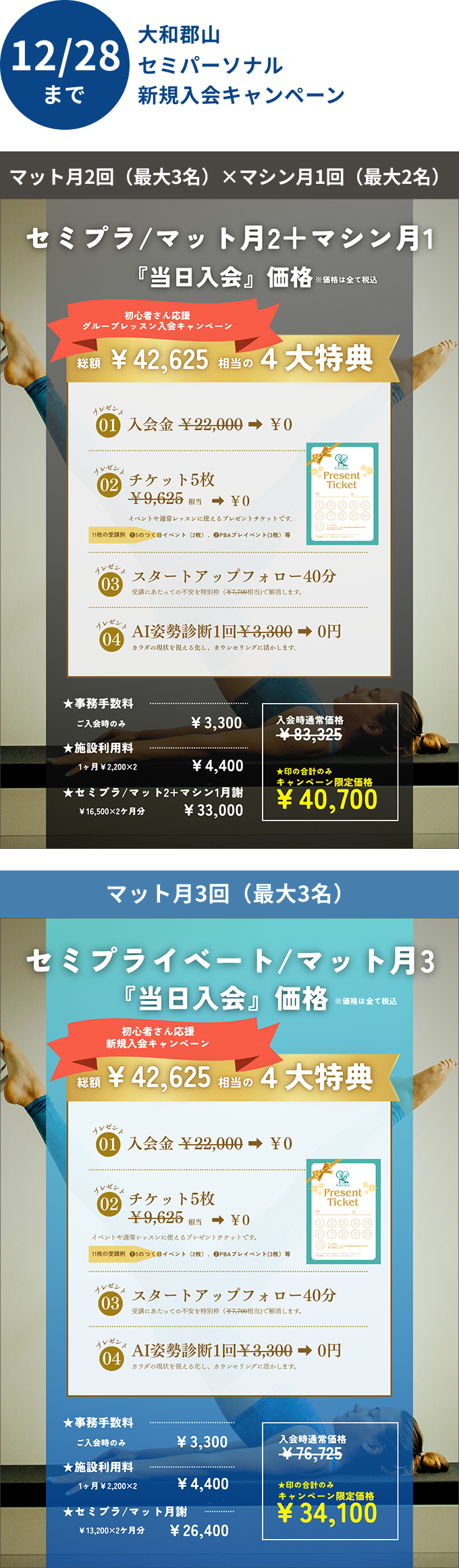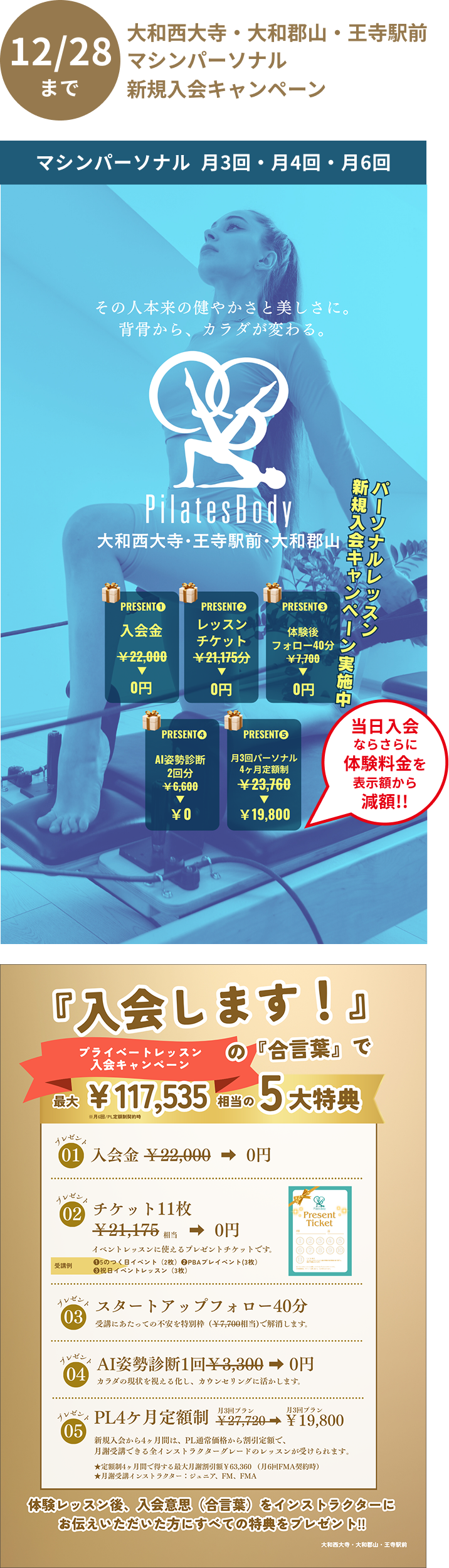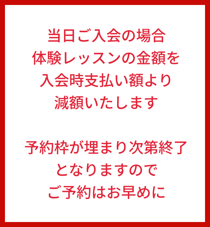 ■適用条件:体験レッスン当日に入会意思『入会します』をインストラクターにお伝えいただき、スタートアップフォローの日時確定後、予定日に入会手続きをすべて完了された方★入会プランはスタートアップフォローでカウンセリングの上お決めいただけます■入会日から4ヶ月の継続利用が条件(途中解約には違約金がかかります)■入会時費用:契約プランの月謝2ヶ月分(レッスン料金参照)、事務手数料3,300円、施設維持費2ヶ月分4,400円(2,200円/月)※大和西大寺のActive4プランのみ入会金22,000円が必要(キャンペーン対象外)■対象期間:2025年12月末まで■その他規約は会則に準じます