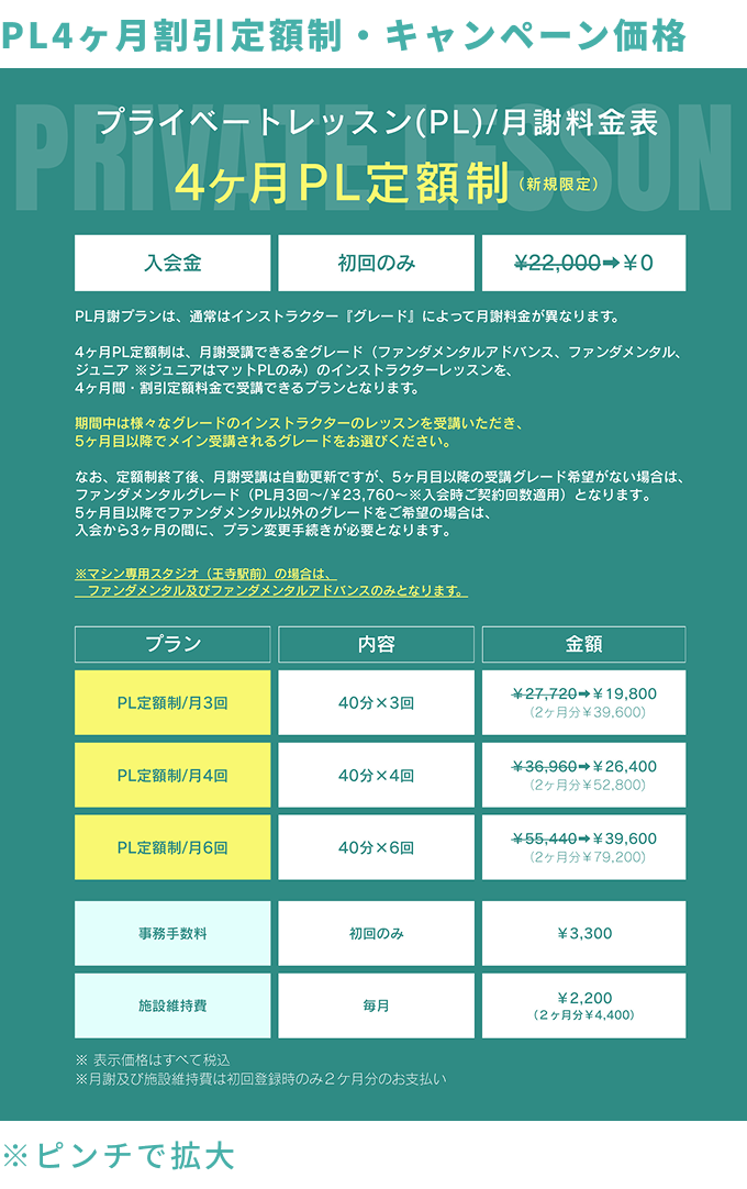 ●PL4ヶ月定額制は、月謝受講できるグレード(ジュニア、ファンダメンタル、ファンダメンタルアドバンス)のインストラクターレッスンを、4ヶ月間・割引定額で受講できるプランとなります。